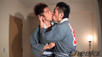 そして途中で画面がフェードするとホテルの一室で法被姿のまま、ベッドで立ったままキスを交わしています。